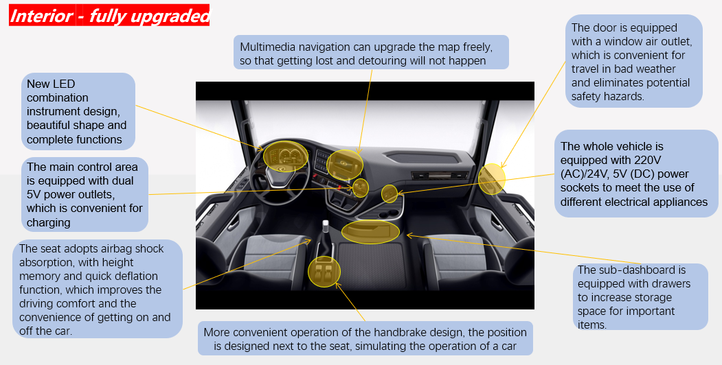 Интерьер серии CAMC H7 полностью модернизирован, низкопольная конструкция кабины обеспечивает больше места и более широкие спальные места; гуманизированные конфигурации, такие как большие приборы, сиденья с пневматической подвеской, кондиционеры и достаточно места для хранения, обеспечивают комфортное пространство для вождения для водителей и пассажиров.